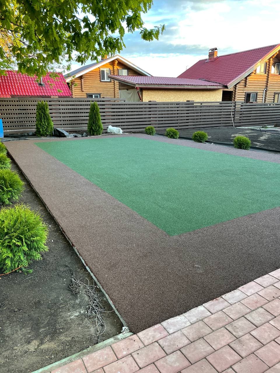 5. материалы: Химтраст ПУ-Клей для резиновой крошки (1К), Химтраст Праймер-РК (1К), Резиновая крошка коричневая, Резиновая крошка изумруд;